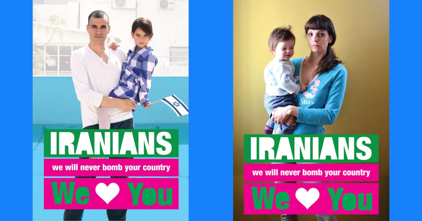 Israël en Iran leven al jaren op gespannen voet. Toen de overheden van beide landen in maart 2012 voor de zoveelste keer opriepen tot oorlog, namen de 41-jarige Ronny Edry en zijn vrouw Michal Tamir een initiatief met impact. Het koppel grafisch ontwerpers postte een opvallende affiche op hun Facebookpagina: een foto van Ronny met zijn dochtertje die zwaait met een Israëlisch vlaggetje en daarbij de tekst: ‘Iranians, we will never bomb your country. We love you’.