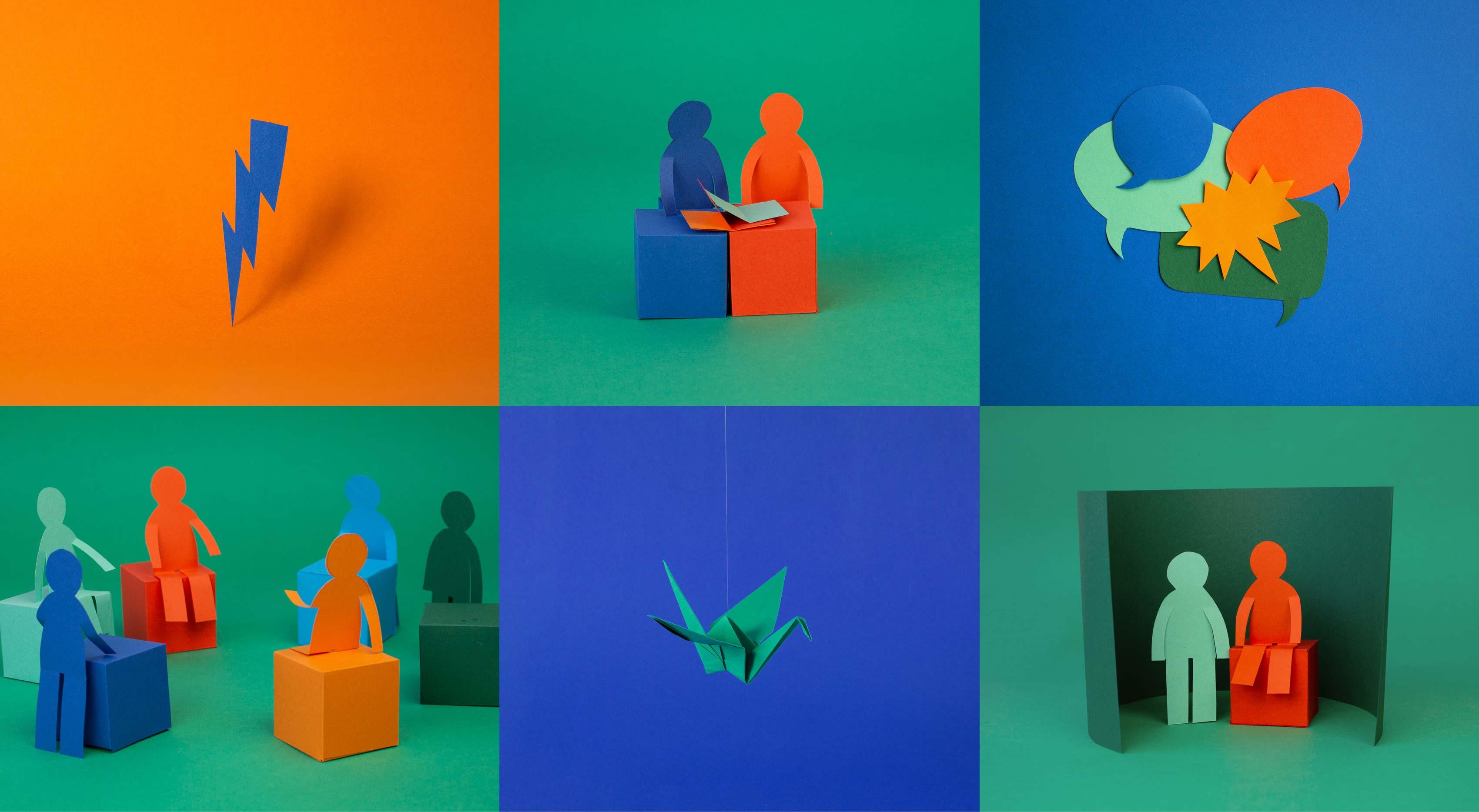 Samen met de huisstijl 2.0 ontwikkelden we een beeldstijl voor SAM, die voortkwam uit het beeld dat we maakten voor jeugdrecht.be. Moeilijke thema’s zijn niet altijd in foto’s samen te vatten, dus gebruikten we papieren composities. Een herkenbare SAM-stijl die ideaal is voor nieuwjaarswensen, uitwerkingen van thema’s en andere grafische zaken.