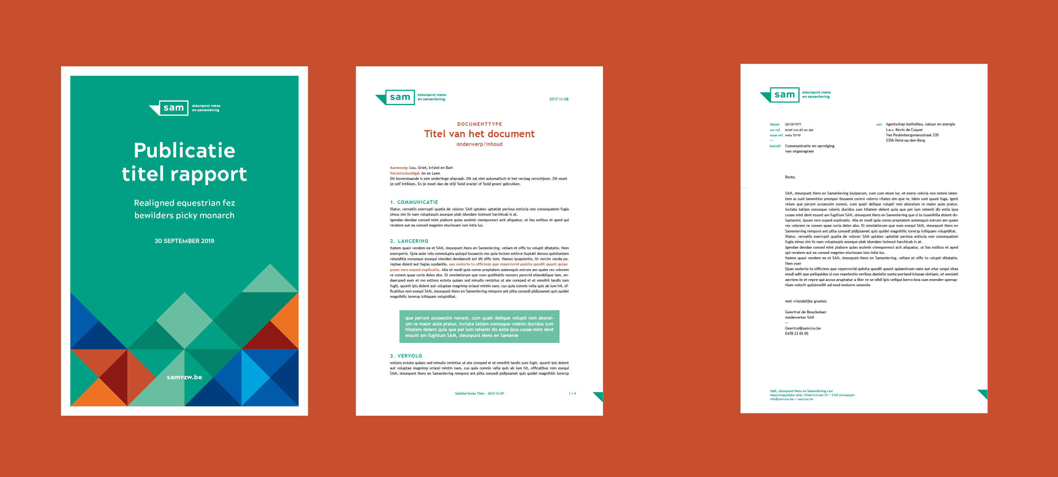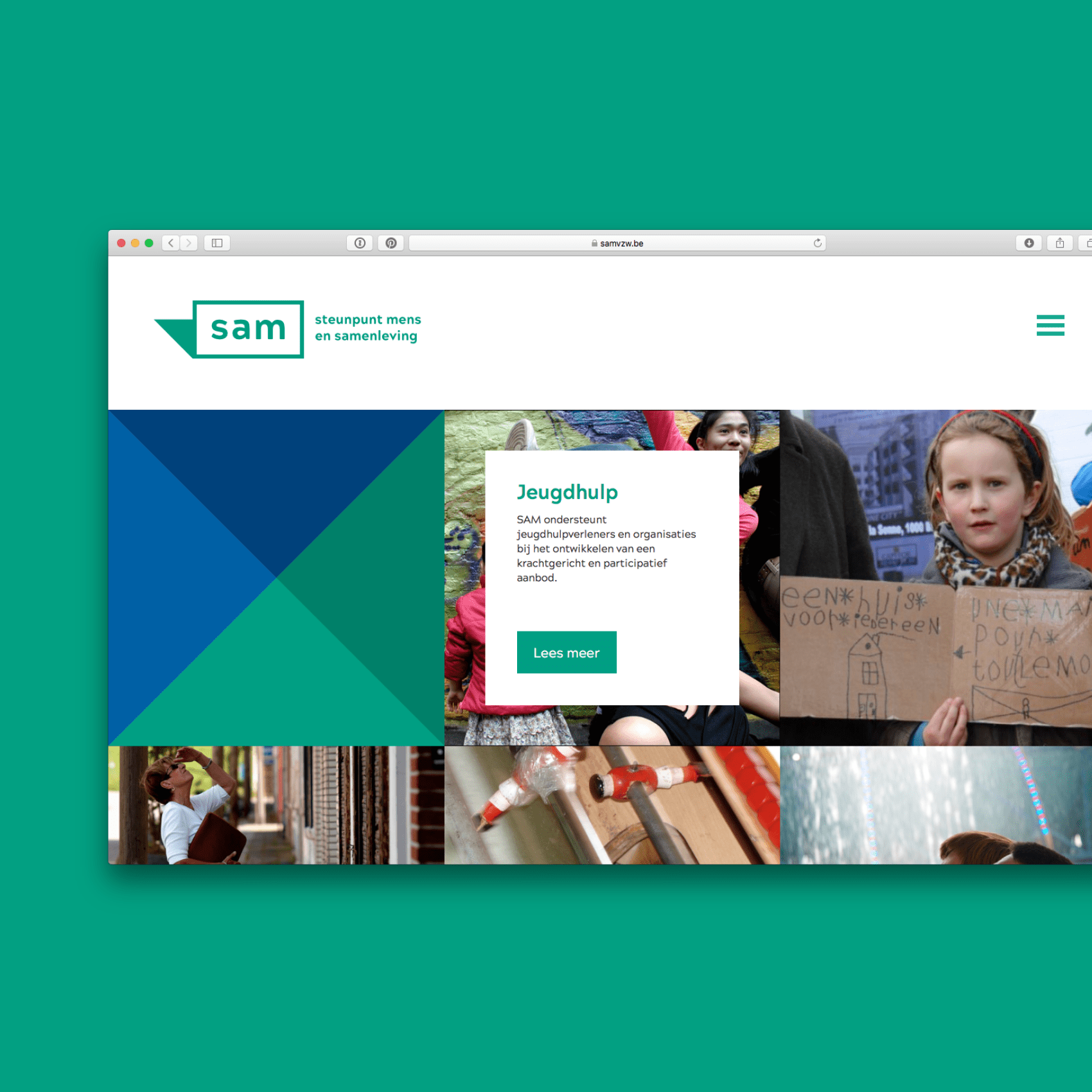 SAM staat voor steunpunt Mens en Samenleving en is een fusie van vijf steunpunten die samen alle facetten van onze samenleving ondersteunen. We ontwikkelden een huisstijl, gebaseerd op die verschillende facetten. Na enkele jaren van samenwerken evolueerde het merk verder, werd het DNA duidelijker en de missie en visie meer uitgesproken. Het werd tijd voor een diepgaand onderzoek naar alle producten, diensten en andere communicatie. Een merkstructuur bracht duidelijkheid.