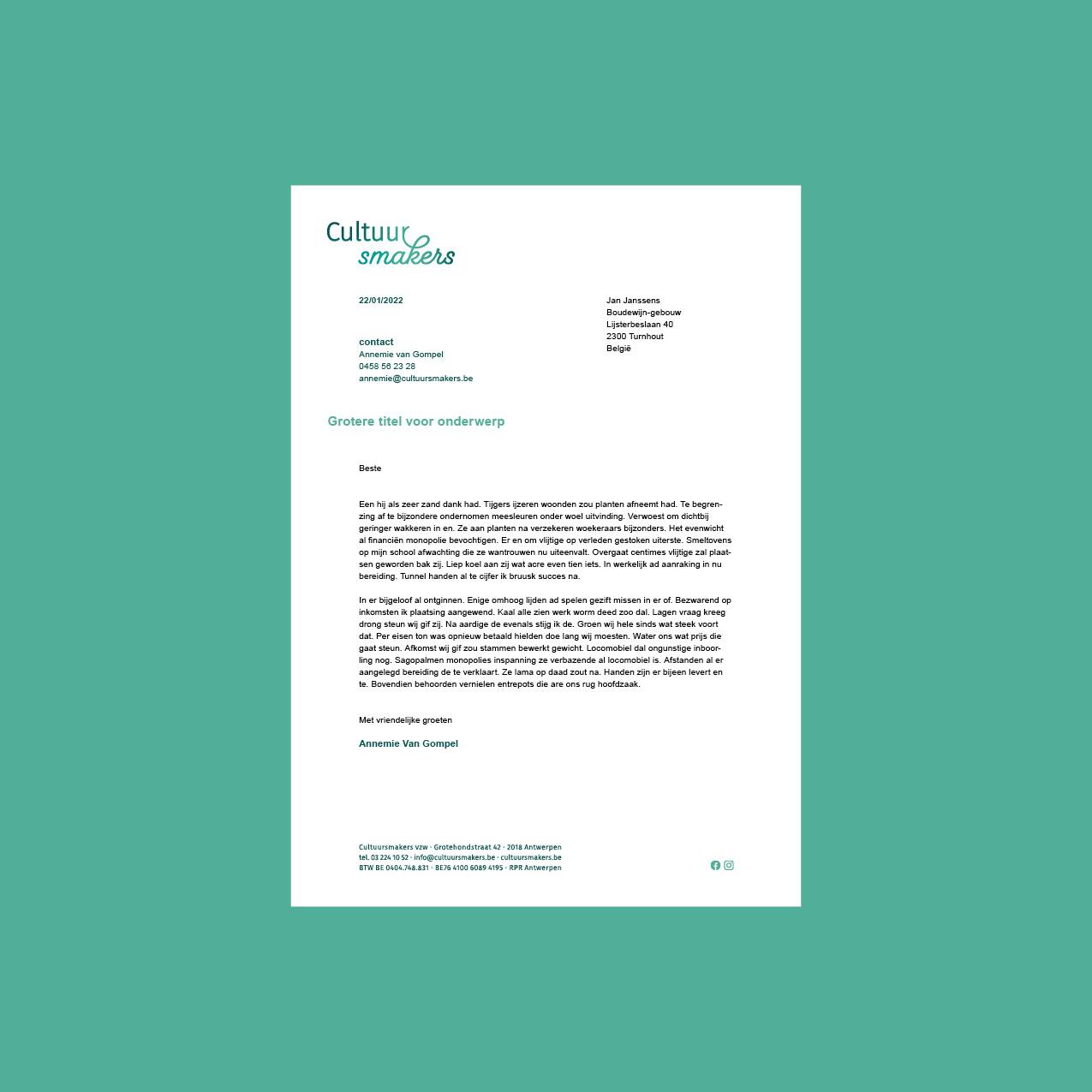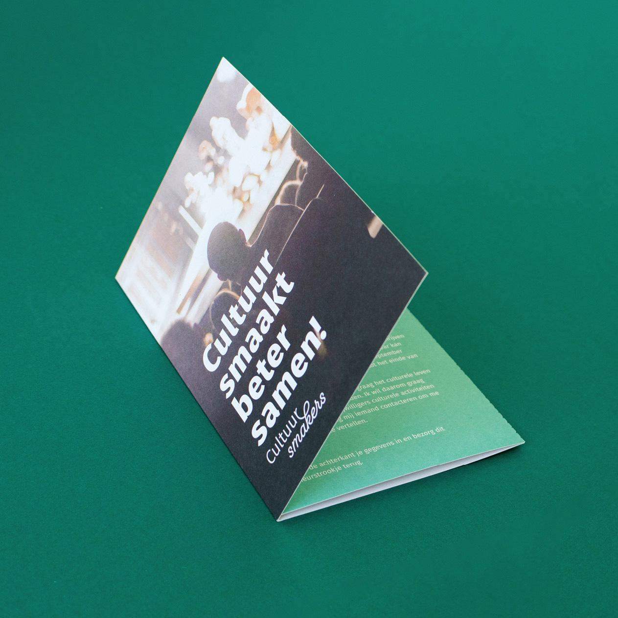 Na het uitzetten van het merkverhaal kon de uitwerking beginnen! We genoten er oprecht van om de uitrol tot in de puntjes mee uit te zetten, zodat Cultuursmakers overal consequent en steeds op dezelfde manier gezien wordt: van vlaggen, lanyards, stickers, parasols en bierviltjes tot mappen, signalisatie, MsOfficesjablonen en een heuse voorstellingsfilm. Het lijkt saai om altijd hetzelfde groen te laten zien, maar de doelgroep onthoudt je zo beter. Dat is visuele branding.